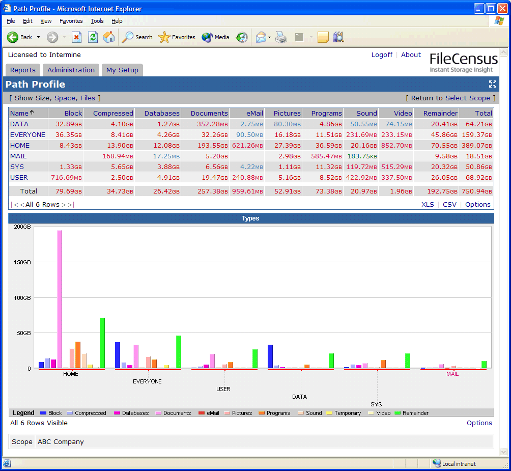 The profile report makes finding abnormal files within your storage environment a simple process. FileCensus allows you to define a range of file categories, each with a list of matching file types. The profile report allows you to compare and contrast the relative sizes of each type of file within all of your volumes. This report is very useful for quickly identifying servers that contain unusual amounts of applications, temporary files or multi-media files.
