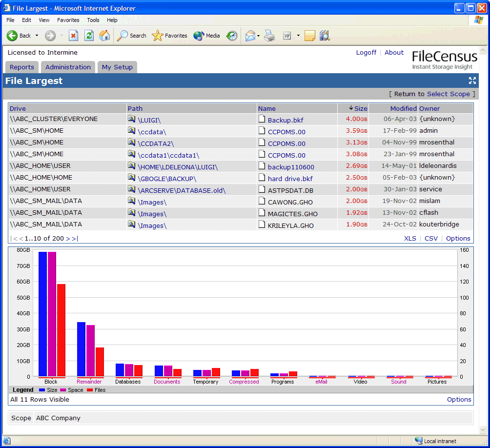 FileCensus can quickly identify files that have been somewhat unmanaged. Given that FileCensus captures information about all of your files, it becomes easy to identify files that are: large, duplicated, replicated, obsolete, orphaned, stale and/or illegal. Once you have examined these files and associated users, directories and shared resources using a range of easy reporting and search screens, FileCensus allows you to regain your capacity -- sometimes up to 40%!